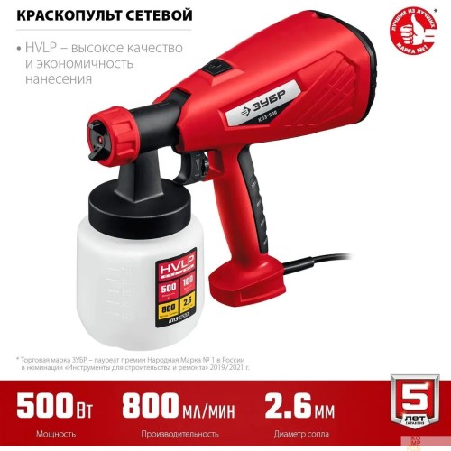 | rusName | Краскопульт, аэрограф Краскопульт ЗУБР "МАСТЕР" КПЭ-500 {электрический, 500 Вт, HVLP, 0.8 л, краскоперенос 0-800 мл/мин, вязкость краски 100 DIN/сек, сопло 2.6мм} |
